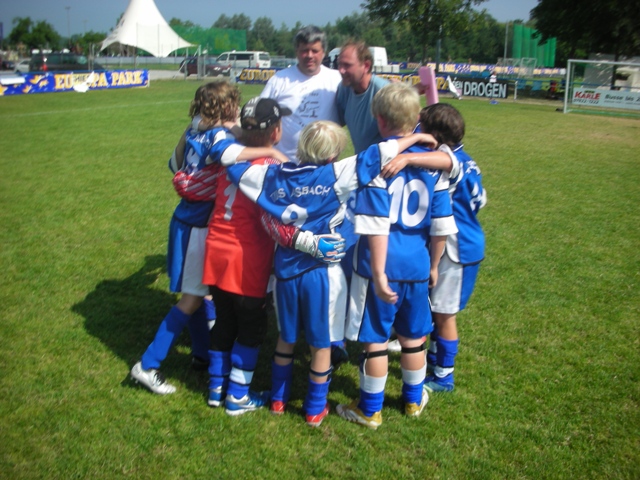 Und dann zum Schluss das Hammerspiel. Die Asbacher Kicker mussten gegen eine Mannschaft aus der Schweiz antreten, den FC Dübendorf. Diese Mannschaft hatte sich schon in der Vorrunde in einer sehr starken Gruppe bestens präsentiert. Der Trainer hatte Asbach daher zu verstärkter Defensive und dem Ausnutzen wahrscheinlich weniger Konterchancen aufgerufen. Was kam war das erwartete Spiel auf ein Tor. Aber was die Schweizer auch anstellten: Jeder Ball aufs Tor wurde entweder sichere Beute des Torhüters oder in einem Fall von Joni im letzten Augenblick von der Linie geputzt. Gefühlte Chancenverteilung bis zur Vorletzten Spielminute: 47:0 für die Schweiz. Doch dann hatte auch Asbach seine Gelegenheit: Weit vorne bekam Koen den Ball und lief allein auf das Tor des Gegners zu. Erst im Strafraum konnte ihn ein Abwehrspieler bremsen. Das allerdings nicht regelgerecht, weswegen dem Schiedsrichter keine andere Wahl blieb, als auf Strafstoß zu entscheiden. Der Trainer beauftragte Maik zu schießen. Der zeigte keine Nerven und verwandelte sicher zum 1:0 Endstand. Das war der Sieg gegen den späteren Turniersieger! Damit konnten die Spieler das Turnier mit einem Gefühl großer Zufriedenheit und der Gewissheit eine richtig tolle Mannschaft zu sein, in Richtung Heimat verlassen.