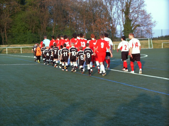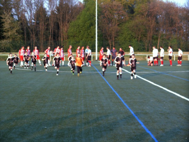 Man, waren wir aufgeregt. Bis es endlich losging, es kam uns vor wie Stunden. Aber dann kamen auch schon die Spieler und nahmen uns an die Hand. Sie waren richtig nett. Und bevor wir uns richtig unterhalten konnten ging es auch schon los. Wir liefen mit den Spielern der Ersten zum Pokalhalbfinale ein. Jan sogar mit dem Schiri. Nachdem wir alle Zuschauer begrüßt hatten, es waren über 100 (auch viele Eltern von uns waren da), liefen wir so schnell wir konnten zurück.