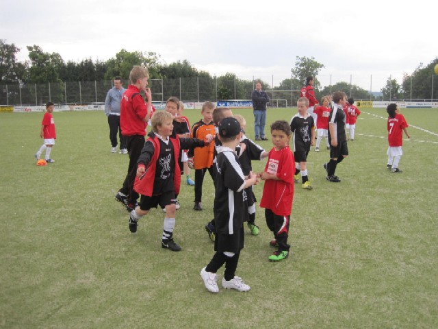 Heute trafen wir auf den Gast von Rheinbreitbach, eine Mannschaft wie wir, die nur aus Spielern vom jüngeren Jahrgang oder sogar Bambinis bestehen. Angetrieben von Jan und Manuel erspielten wir uns Chancen von Anfang an. Durch zwei platzierte Schüsse von Manu (3. 7.) und einem Treffer von Felix (11) war eine beruhigende Führung herausgespielt. Trotzdem spielten wir weiter nach vorne, hatten noch viele Chancen, aber kein Glück im Abschluss (oder zuwenig Torschusseinheiten im Training?). Kurz vor der Halbzeit kam Rheinbreitbach zum Anschlusstreffer, als der Stürmer alleine auf Pascal zulief und dieser trotz eines Superreflexes den Treffer nicht verhindern konnte.