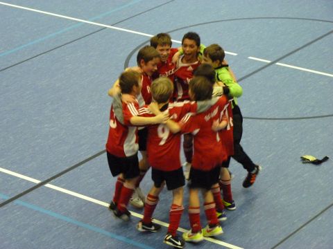Es war klar, der Sieger des Spiels wäre Turniersieger, bei Unentschieden wären wir es aufgrund des besseren Torverhältnisses. Wir begannen stürmisch, die Anfangsphase gehörte uns. Chance über Chance, aber das Ding wollte nicht rein. Dann kam Rheinbrohl in der fünften Minute durch einen schönen Konter erstmalig gefährlich vor unser Tor, aber Torwart Levin und die Abwehrspieler Jonas und Lukas konnten in letzter Sekunde noch retten. In der 7.Minute war es dann aber so weit. Rheinbrohl konterte und kam zu einer Ecke und die brachte das 1:0. Der Junge aus Rheinbrohl hatte den Ball, technisch hochanspruchsvoll, als Direktannahme mit links direkt unter die Latte geknallt. Da war für Levin nichts zu halten. Irgendwie gab das unserem Spiel einen gewaltigen Knick, wir spielten zwar nach vorne, aber der Esprit war weg. Rheinbrohl war mit seinen Kontern gefährlicher als wir in dieser Phase. Die Minuten verrannen. Das Glück schien nicht auf unserer Seite zu sein. Zweieinhalb Minuten noch zu spielen. Ecke für uns, alle nach vorne. Ob wir jetzt noch das 0:2 kassierten, war ja eigentlich egal. Die Ecke von Arif kam hoch rein, Nico ging wieder zum Kopfball hoch und Jaaaaaaaaaaaaaaaa !!! Der Ball war drin. Nico’s wuchtiger Kopfballaufsetzer sprang einen halben Meter vor dem Tor auf den Boden auf und ging dann über den gegnerischen Abwehrspieler ins Rheinbrohler Tor. Riesenjubel der Jungs, des Trainers und der vielen mitgereisten Fans. Die Uhr zeigte noch 2:08 Minuten zu spielen an. Aber danach passierte auf beiden Seiten nichts mehr. Jonas als Abwehrchef und die anderen Jungs ließen nichts mehr anbrennen. Schlusspfiff. In einem hochspannenden Klassespiel beider Mannschaften, das auf absolut fairem Niveau ablief, hatten wir den so wichtigen Punkt geholt und die Jungs konnten mit ihrem Humba-Tanz den Turniersieg feiern. Grosses Kompliment an alle. Ihr wart alle spitze.