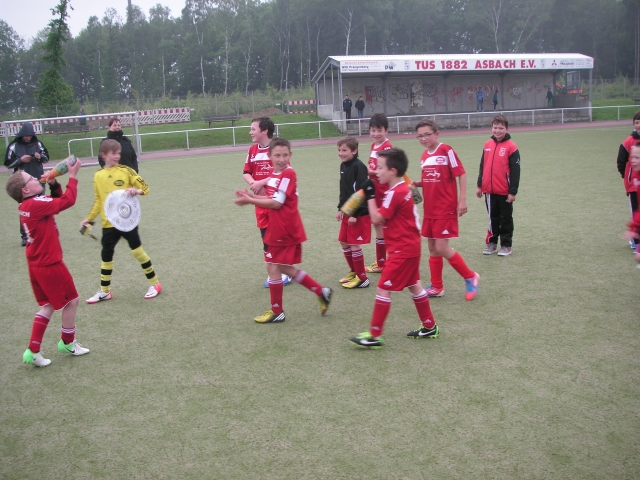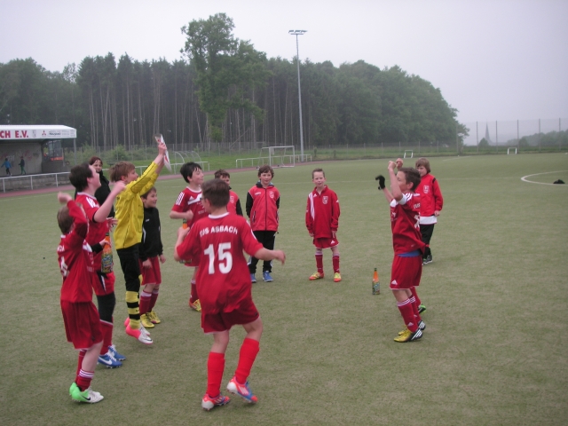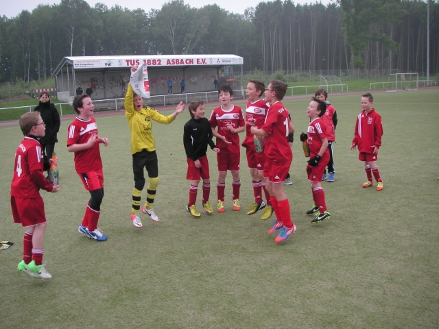Heute trafen wir zum letzten Spiel der Rückrunde auf die Jsg Ellingen 2. Nur ein Sieg würde uns den Staffelsieg bringen. Entsprechend nervös begannen wir. Dann Herzstillstand: 20 Meter Lattenknaller von Ellingen. Durch Laurin wurde schlimmeres verhindert. Nach einer Viertelstunde die erlösende Führung durch schöne Kombination mehrerer Spieler mit Abschluss durch Can. Zu einem psychologisch wichtigen Zeitpunkt viel das 2:0 durch Max. So ging es in die Pause. Der herausragende Trainer konnte die Jungs nochmals motivieren. Dann machten 3x Max und 1x Louis das Spiel klar. Ellingen erzielte zwischendurch den Ehrentreffer und machte die Eltern nochmals leicht nervös. Sieg und Staffelsieger!! Robert läuft schneller als Jupp Heynckes, um der Sektdusche zu entgehen. Nur mit Hilfe von Maxi und Marius wurde er eingefangen.