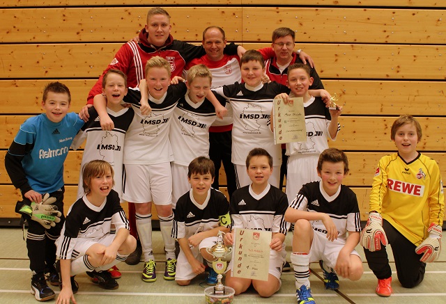 Am Sonntag den 26.01.2014 fuhren wir, am frühen Morgen mit dem 2003er Jahrgang zum Turnier nach Oberpleis. Der Spielplan sah zwei Gruppen vor. In unserer Gruppe waren SSV Kalldauen, TUS 05 Oberpleis II, ASV Sankt Augustin und Fortuna Köln. Besonders auf die Partie mit Fortuna Köln waren alle gespannt. Die erste Partie gegen Oberpleis startete mit einem Blitztor von Max Strüder. Kaum war angepfiffen zappelte der Ball im Netz. Moritz Kohr konnte auf 2:0 erhöhen bevor Jan Kowalski den 3:0 Endstand erzielte. Trotz des klaren Ergebnisses waren wir nicht zufrieden mit dem Spielaufbau. Dieses sollte sich im zweiten Spiel gegen Sankt Augustin auch bewahrheiten. Denn ein Fehlpass vor unserem Tor führte zum 0:1. Jetzt war es besonders wichtig gegen Fortuna Köln einen Punkt zu holen, um noch eine Change auf das Endspiel zu haben. Die Marschrute war daher defensiv ausgerichtet und hatte Erfolg. Zu unser aller Freude gelang es Moritz Kohr, einem schönen Konter über mehrere Stationen abzuschließen. Vor unserem letzten Gruppenspiel stand fest, das wir mit einem hohen Sieg ins Finale einziehen konnten. Alle waren hoch motiviert und gegen den schwächsten Gegner der Gruppe fielen die Tore, wie wir sie brauchten und das Ergebnis von 4:0 reichte fürs Endspiel. Die Tore erzielten Max Strüder zum 1:0, 2:0 und 4:0 und Moritz Kohr zum 3:0. Im Finale trafen wir auf den JFC Mondorf-Rheidt, der in der anderen Gruppe alle Spiele gewonnen hatte. Das Spiel war lange ausgeglichen doch bei einem Konter konnte Manuel Buda den abgewehrten Schuss zum entscheidenden Treffer verwerten. Nach dem Schlusspfiff war die Freude riesig und neben dem Siegerpokal bekam Max Strüder den Pokal für den besten Torschützen.