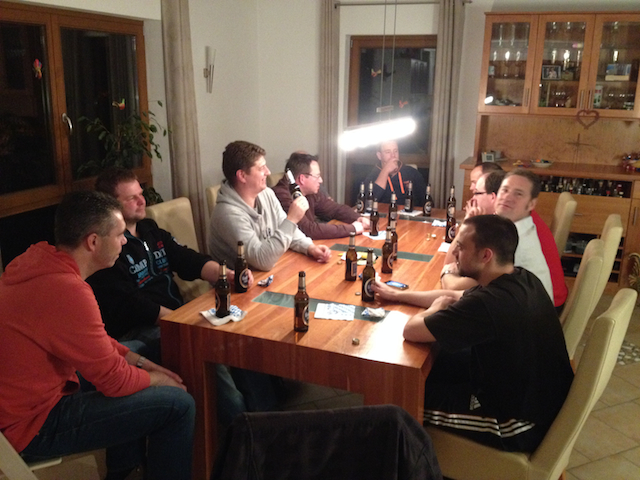 Dann plötzlich ging es um einen selten zu findenden Schnaps. Als die Rede vom "Hämmerle" war (ich weiß gar nicht wie wir auf hämmern kamen), wuchs Frank ein breites Grinsen ins Gesicht. Frank stand auf und öffnete seine Waffenkammer. Mitten aus all den vielen Flaschen zog er eine Flasche Hämmerle raus. Einige stiegen dann vom Bier zu einer Schnapsprobe um. Frank zeigte was er hatte und reichte fleissig nach. Bei manchen kam dann auch der dicke Hammer.