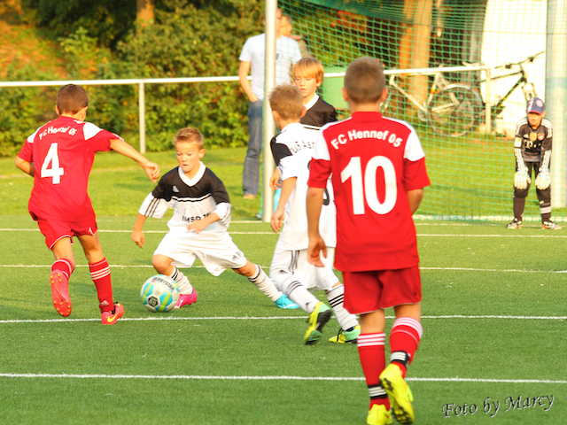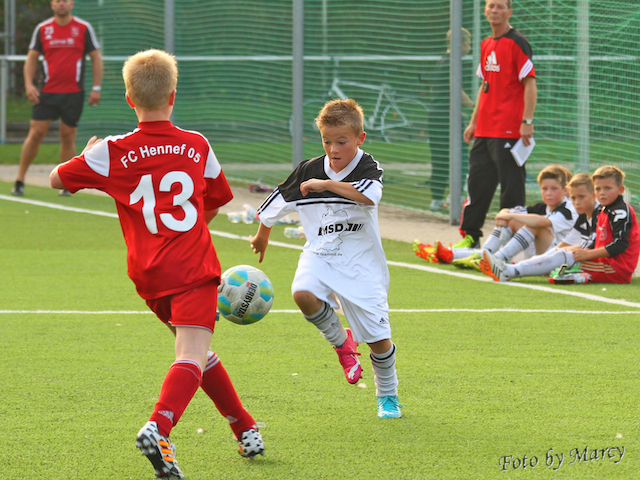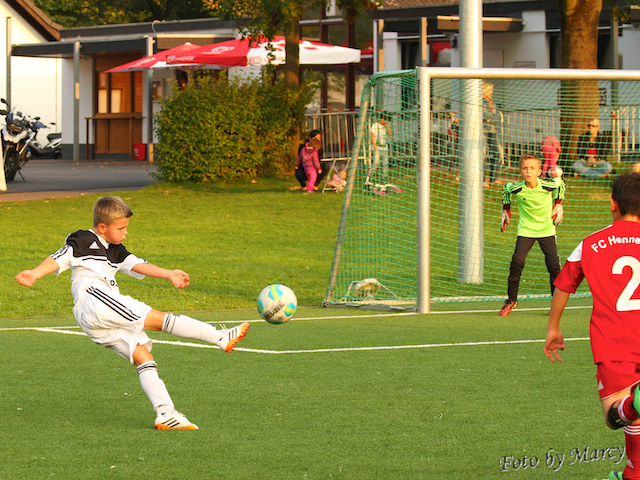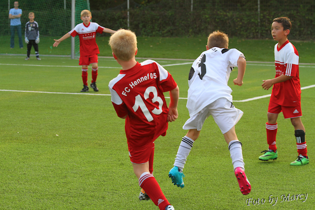 Nach einem Torab von Vincent konnte mit nur fünf Ballkontakten über das gesamte Spielfeld Tarin den Führungstreffer erzielen, Hennef gleichte nach nur zwei Minuten aus. Sechs Minuten später konnte Kevin mit einem super Heber genau unter die Latte (ein Traumtor) erneut die Führung sicherstellen. Hennef glich in der 31.Minute aus. Leon hat in der 39. Min. erneut den Führungstreffer erzielt und in der Schlußminute konnte Hennef noch den Ausgleichstreffer erzielen.