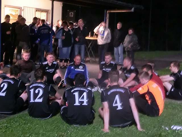Nach Wiederbeginn drängte die Asbach/Buchholzer Mannschaft mit aller Macht auf den Ausgleich. Die Chancen dazu häuften sich jetzt fast im Minutentakt, doch im Abschluss waren die Einheimischen zu unkonzentriert: Freistoß von Maik Römer (50.), Alleingang von Maik Römer (54.), Schuss von Nils Amelong (56.) und von Lino Majer (57.). Dann endlich die Erlösung: Einen Schuss vom Maik Römer kann der JK-Torwart mit dem Fuß abwehren, doch Spielführer Nico Sven Hermann ist zur Stelle und kann den Ball über die Torlinie zum Ausgleich bugsieren (58.). Im weiteren Verlauf hatte die A-Jugend noch zwei gute Chancen durch Jonas Majer (68., 75.), doch das Siegtor wollte nicht fallen. Erst gegen Ende des Spiels wurden die Gäste wieder offensiver, übertrieben allerdings ihren Einsatz, sodass es noch in der Nachspielzeit eine Rote Karte (90.+2) gab. Schlusspfiff – Großer Jubel auf dem Platz und neben dem Platz: Kreismeister 2014/15.