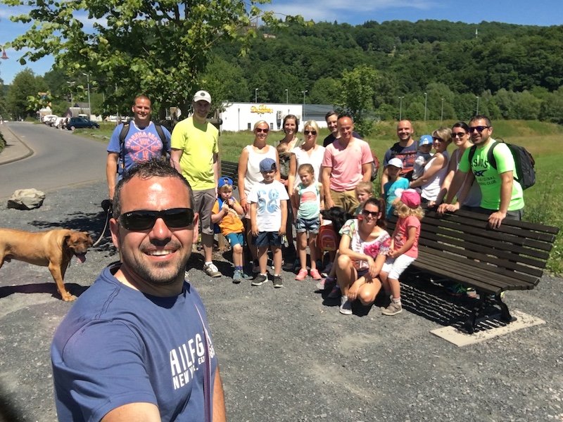 Während ein großer Teil die Heimreise antrat, ein kleiner Teil ein weiteres Kaltgetränk genoss, ging es für 21 Personen und drei Hunde zu Fuß in Tal. Eigentlich kommt man bei gemütlichem Spazieren in 2h nach Roßbach. Wir gingen jedoch so gemütlich, dass es deutlich länger dauerte. In 1,5h waren wir nicht mal in Hausen am Schwimmbad. Der Sonntag war eh gehalten, also ging es entspannt weiter.