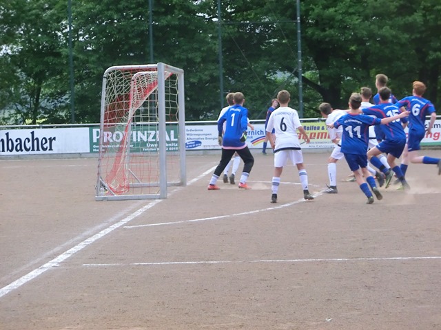 Anfangs hatten wir auf dem Hartplatz Probleme mit dem ungewohnten Untergrund. Mit der Spielweise der Gastgeber, hoch und weit nach vorne, kamen wir am Anfang auch nicht zurecht. Mit zunehmender Spieldauer wurden unsere Aktionen immer sicherer, wir gestalteten das Spiel ausgeglichen und hatten durch Luca unsere erste Chance, der sich gegen seinen Gegenspieler durch setzte und alleine aus Tor zu lief, aus spitzem Winkel verzog er aber knapp.