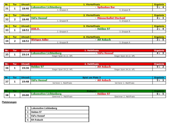 Die acht besten Mannschaften der Vorrunde erreichten die K.O.-Runde und durften weiter vom großen Wurf träumen. Für die Mannschaften SPiLunKen Bar, Männerballett Etscheid, ASK.O. und die Wirtgen Adler war dann allerdings im Viertelfinale Schluss und so lauteten die Halbfinalbegegnungen Lokomotive Lichtenberg vs. FäFu Hennef (Endergebnis 4:3) und Helden 97 vs. AH Asbach (5:2).