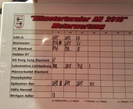 Die Meterwertung ging an die trinkfesten Herren der SPiLunKen Bar. Die als Favorit gestarteten SPiLunKen hatten zu Beginn des Meterwettbewerbs leichte Probleme mit dem metrischen System (vielleicht weil deren Chefeinkäufer ein Waliser ist - 1 Meter = 3,28 Fuß…) und konnten das erste Mal anschreiben, nachdem sich der FC Blackout (4x) und die Bierleader (3x) bereits einen satten Vorsprung erarbeitet hatten. Auf Strecke aber waren die Teilzeitprofis aus Watemisch nicht zu schlagen und siegten am Ende souverän mit 19 Metern vor der Lokomotive aus Lichtenberg (16) und ASK.O.(13) Die zu Beginn starken Mannschaften Bierleader und FC Blackout landeten am Ende gleichauf (12) im Mittelfeld.