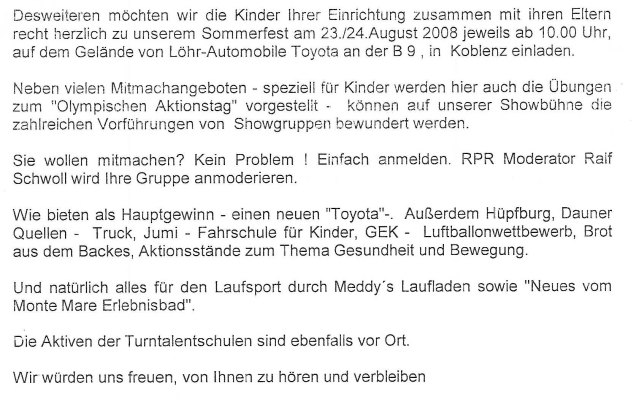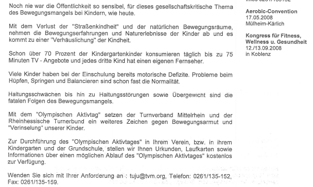 Olympischer Aktivtag Nachfolgender Text schickte uns der Turnverband Mittelrhein. Alle Interessierten sollten sich mit Gabi Krautscheid (49 36) in Verbindung setzen. Bildergalerie 26.06.2008 10:56:58 Robert Winter 919 Breitensport
