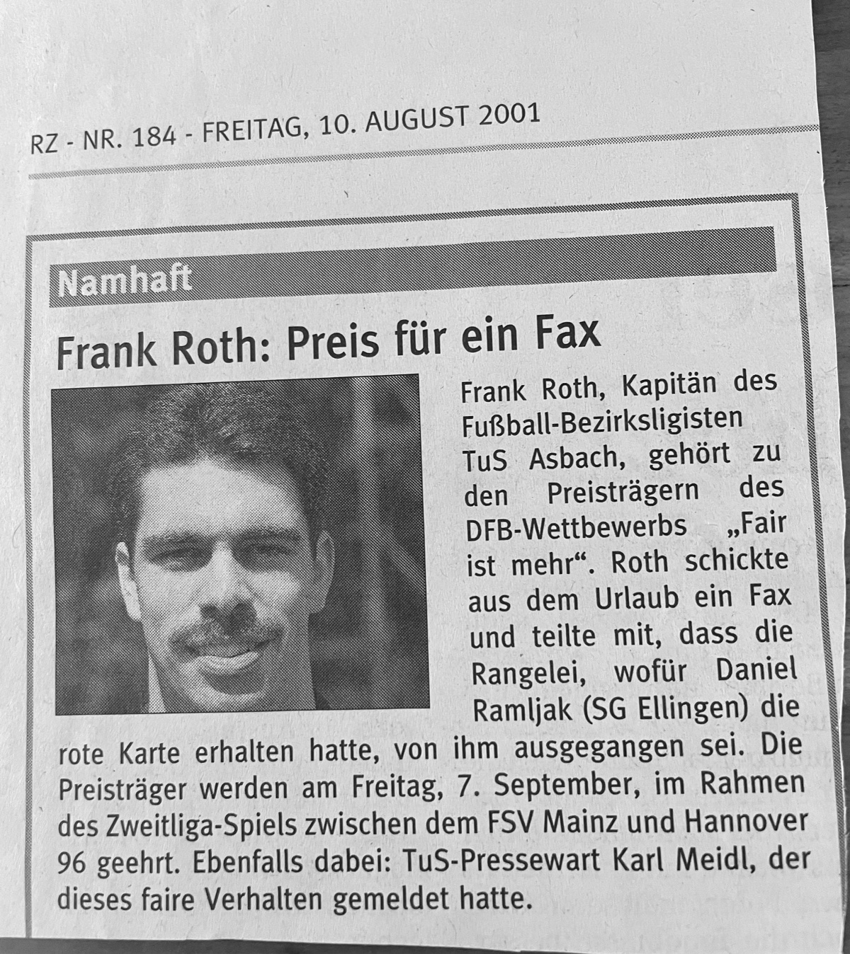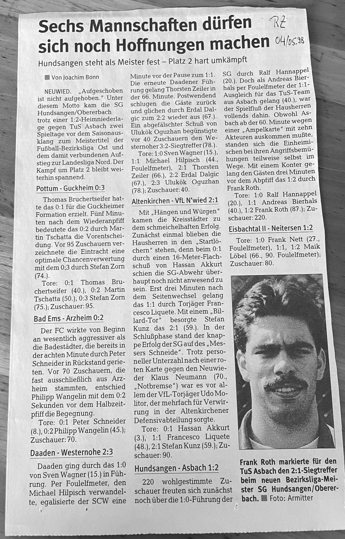 Frank (Jahrgang 1973) durchlief beim TuS ab E-Jugend sämtliche Jugendmannschaften. Nach dem Übergang in den Seniorenbereich spielte er zunächst in der 2.Mannschaft, doch bald erkannten die Trainer seine Qualitäten und „beförderten“ ihn zur ersten Mannschaft. Das von ihm erwähnte Spiel in Hundsangen (siehe Interview) fand nach seiner Aussage 1998 statt. Im Internet ist dazu leider nichts mehr zu finden, aber als Beweis hat er einen Zeitungsartikel aus seinem Archiv geholt.