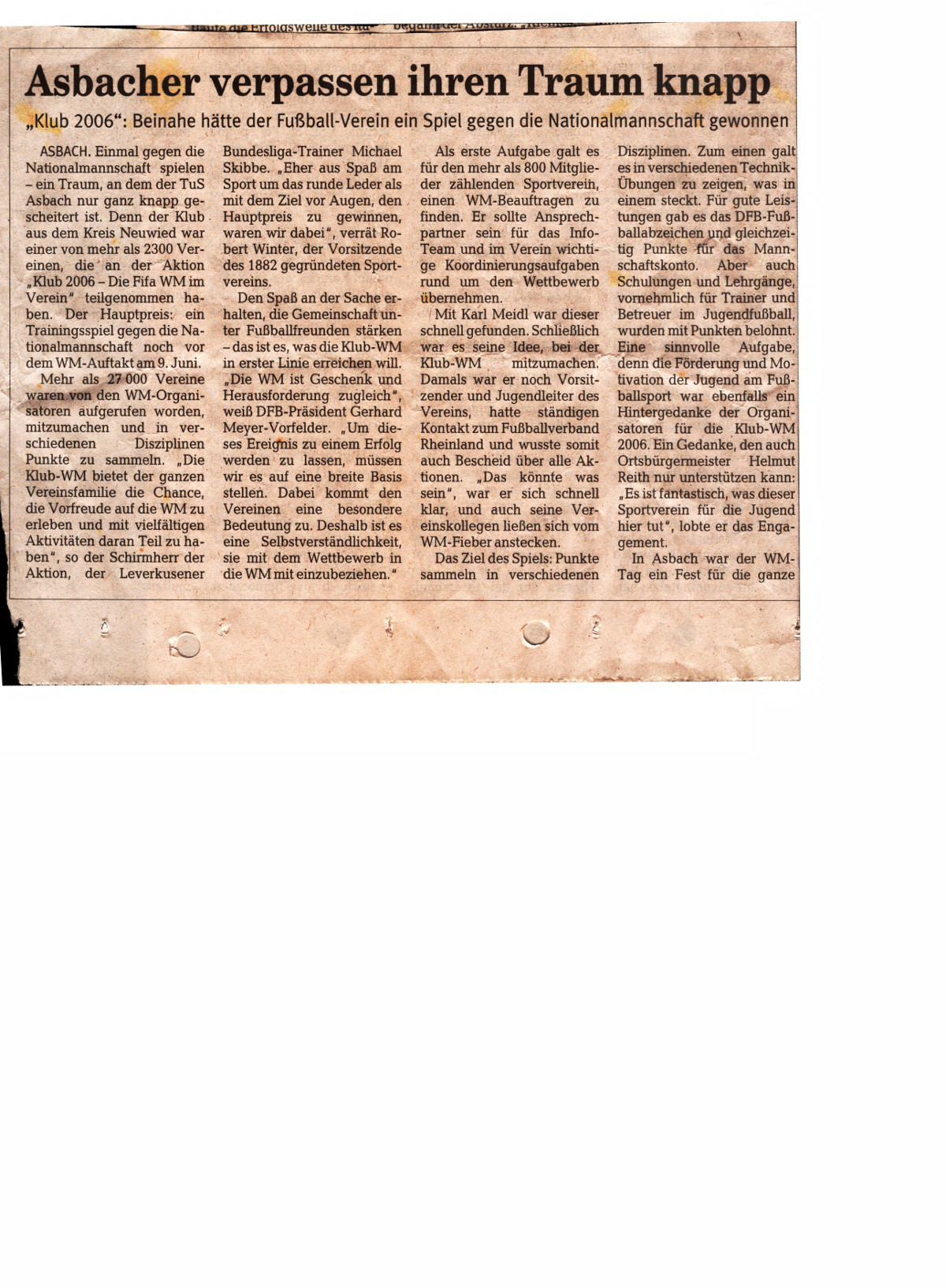 Und dann kam der spannende Moment: Oliver Bierhoff zog den FSV Luckenwalde, der später vor 20000 Zuschauern im Mannheimer Stadion mit 0:7 verlor. Man stelle sich vor, der TuS wäre der Glückliche gewesen! Ganz Asbach wäre bestimmt mit einem Sonderzug nach Mannheim gefahren und „Mini“ Weißenfels hätte nach dem Spiel, das im TV live übertragen wurde, an der Presse-konferenz mit seinem „Kollegen“ Jürgen Klinsmann teilgenommen. Natürlich war man in Asbach enttäuscht. Aber nicht lange! Immerhin war ASBACH für ein paar Stunden in aller Fußballer-Munde!