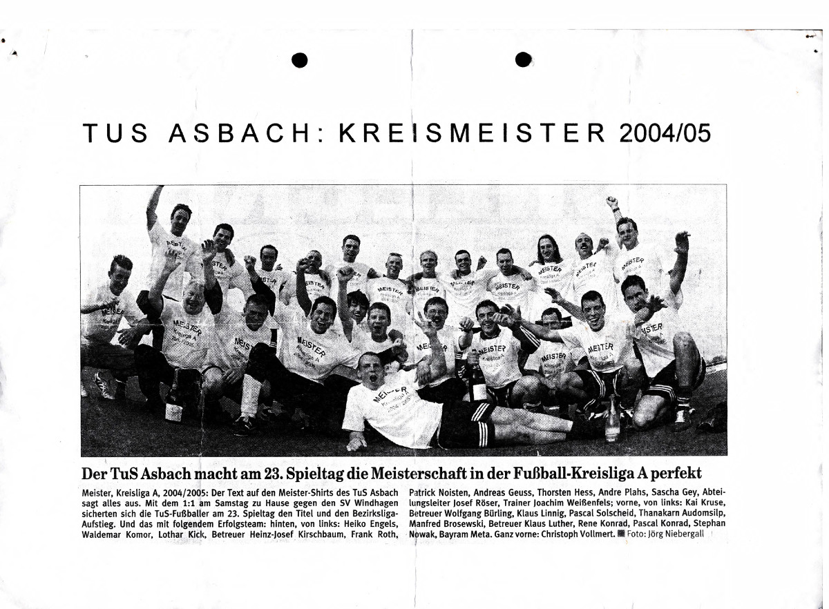Natürlich wird der Name „Mini“ Weißenfels immer mit dem grandiosen Aufstieg in die Bezirksliga verbunden sein. Mit elf Punkten Vorsprung vor dem Zweiten SG Horressen und 22 Punkten (!) Vorsprung vor dem Dritten SG Puderbach beendete der TuS die Saison 2004/05. Überhaupt war 2005 ein Superjahr für den TuS, sodass im amtlichen Verbandsorgan „Fußball im Rheinland“ eine ganze Seite mit der Überschrift „Keine Aufstiegsfeier ohne TuS Asbach“ über die Erfolge berichtet wurde: Aufstieg der 1., 2. und 3.Mannschaft (allerdings verzichtet!) sowie der A- und C-Jugend! Nä, wat wor dat dann fröher en superjeile Zick, mit Träne in d'r Auge loor ich manchmol zurück!