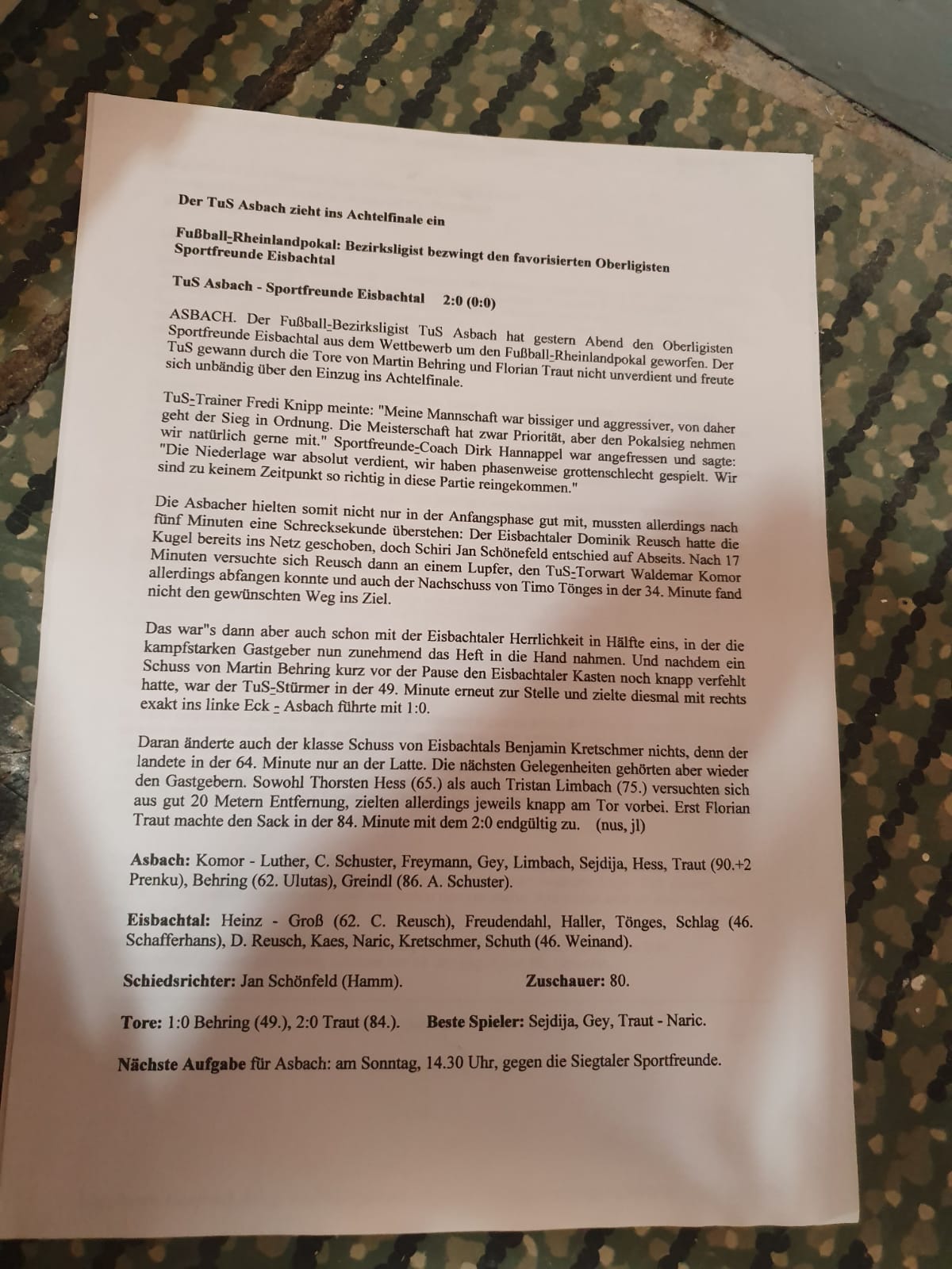Das von ihm erwähnte Pokalspiel fand am 18.11.2009 statt. Dazu schrieb der TuS-Pressewart: „Was keiner erwartet hatte, trat gestern Abend ein: Der TuS warf den Oberligisten SF Eisbachtal mit 2:0 aus dem Pokal und das sogar verdient! Damit steht der TuS im Achtelfinale – eines seiner größten Erfolge!