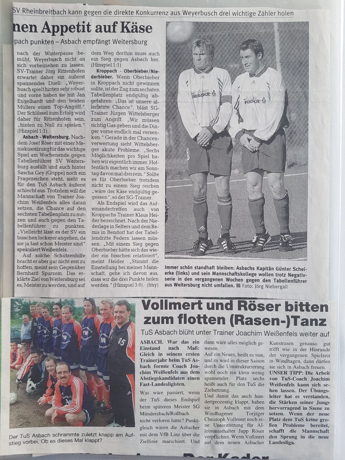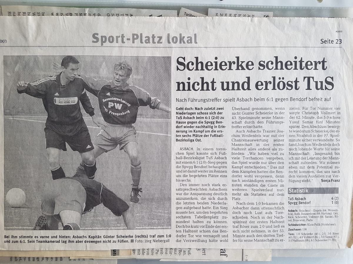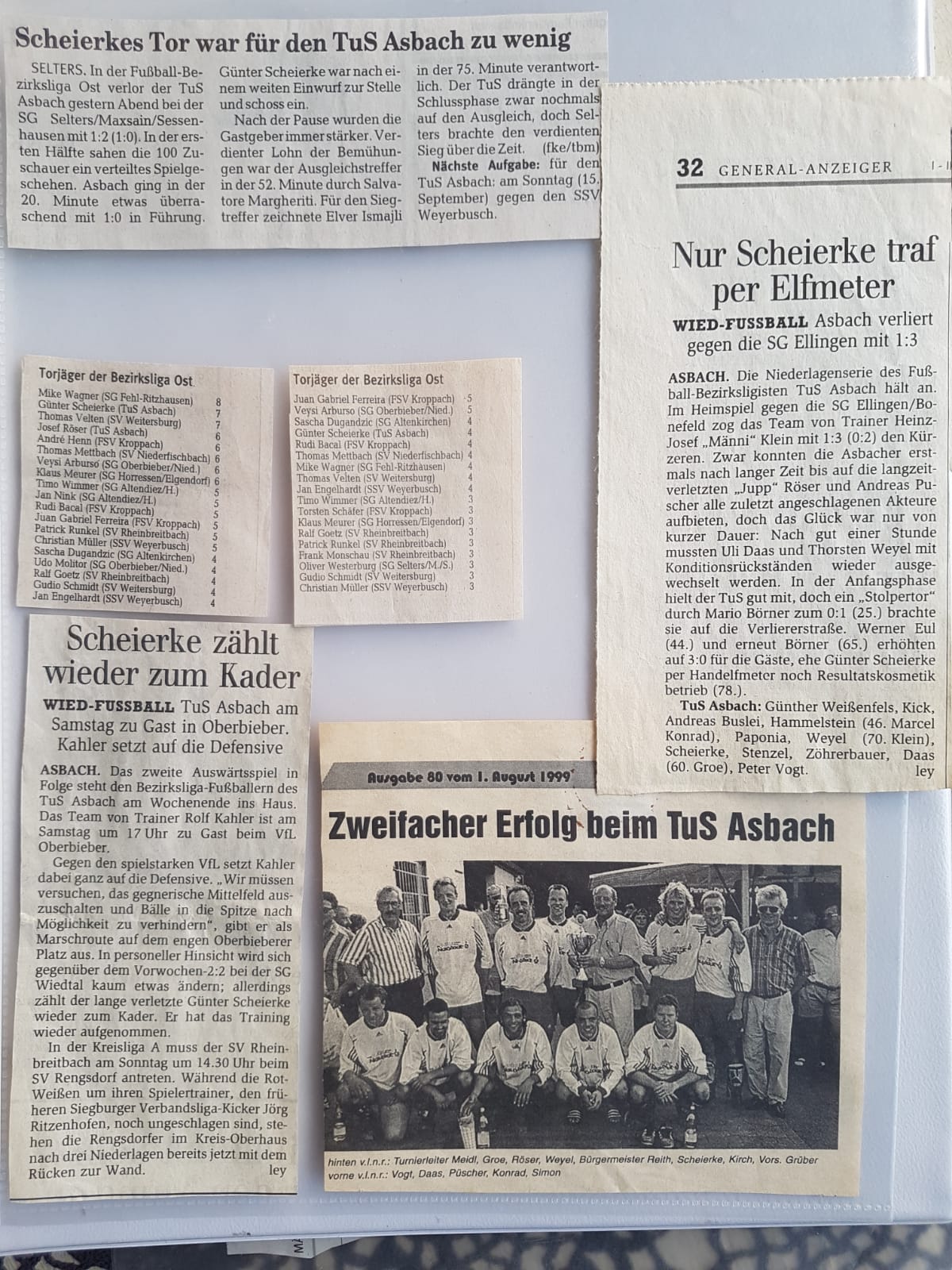 Günther „Jünnes“ Scheierke, Jahrgang 1968, Markenzeichen blonde Mähne und Fahrer eines speziellen Autotyps, spielte nach seinen Angaben sieben Jahre beim TuS und fast immer in der Bezirksliga. Da das Asbacher Fußball-Archiv erst ab der Saison 2003/04 digitalisiert ist, gibt es Probleme mit dem Faktencheck. Und da taucht er erst 2007 als Aushilfe in der Zweiten auf.
