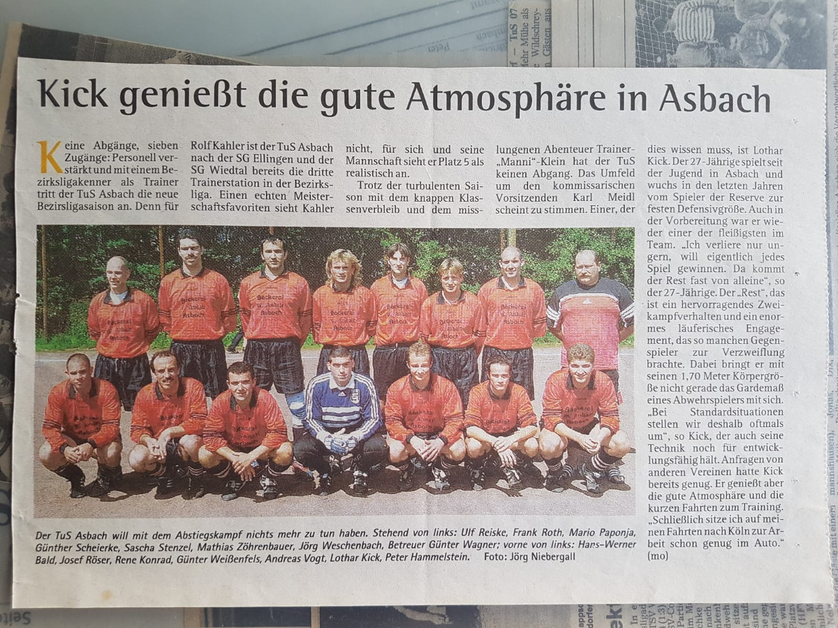 Nach „Adam Riese“ müsste er dann 1997 zum TuS gekommen sein und hat dann 2003, als der TuS aus der Bezirksliga abgestiegen ist, verletzungsbedingt eine längere Pause einlegen müssen. Trainer in seiner Asbacher Zeit waren Jupp Röser (1997 – 2000), der ihn auch zum TuS geholt hat, Rolf Kahler (2000/2001) und „Mini“ Weißenfels (2001/03).