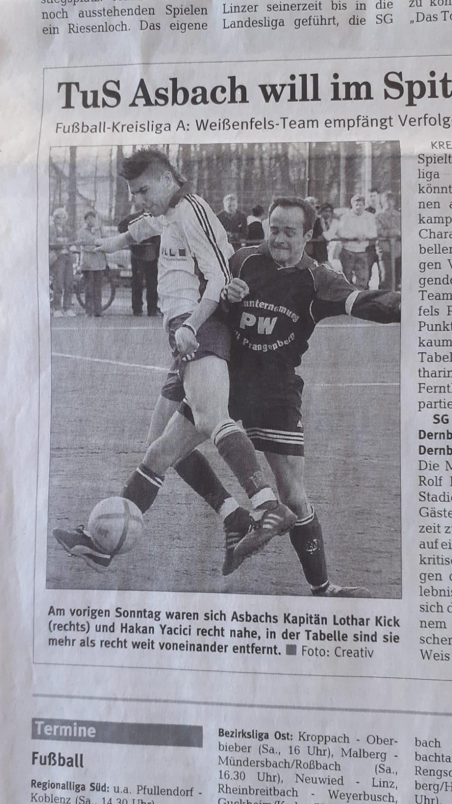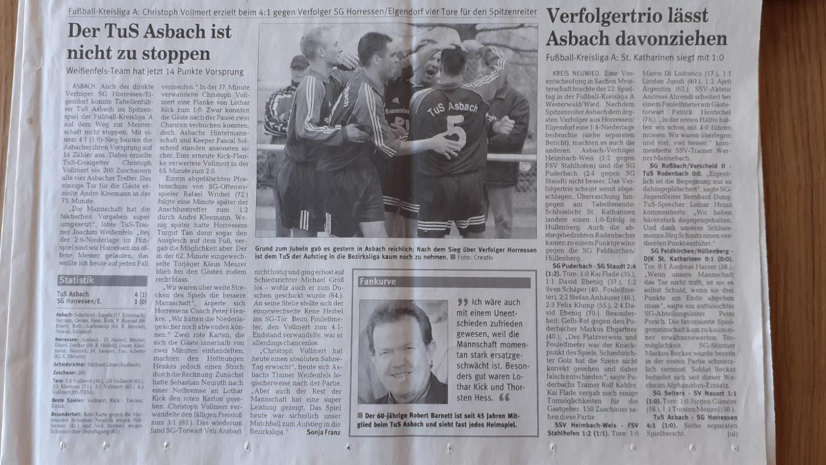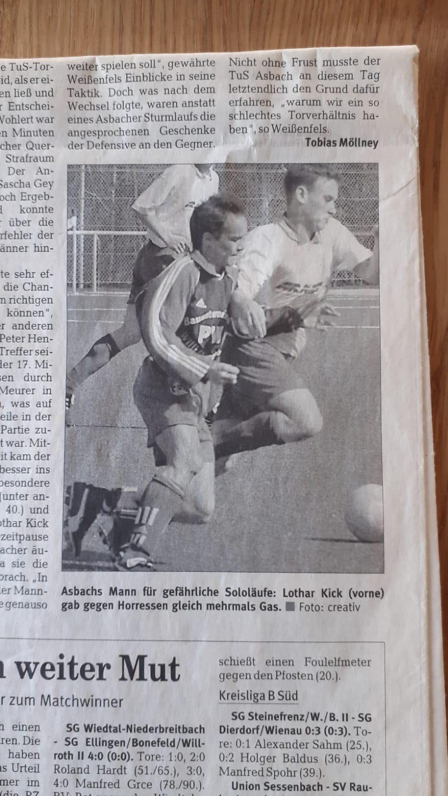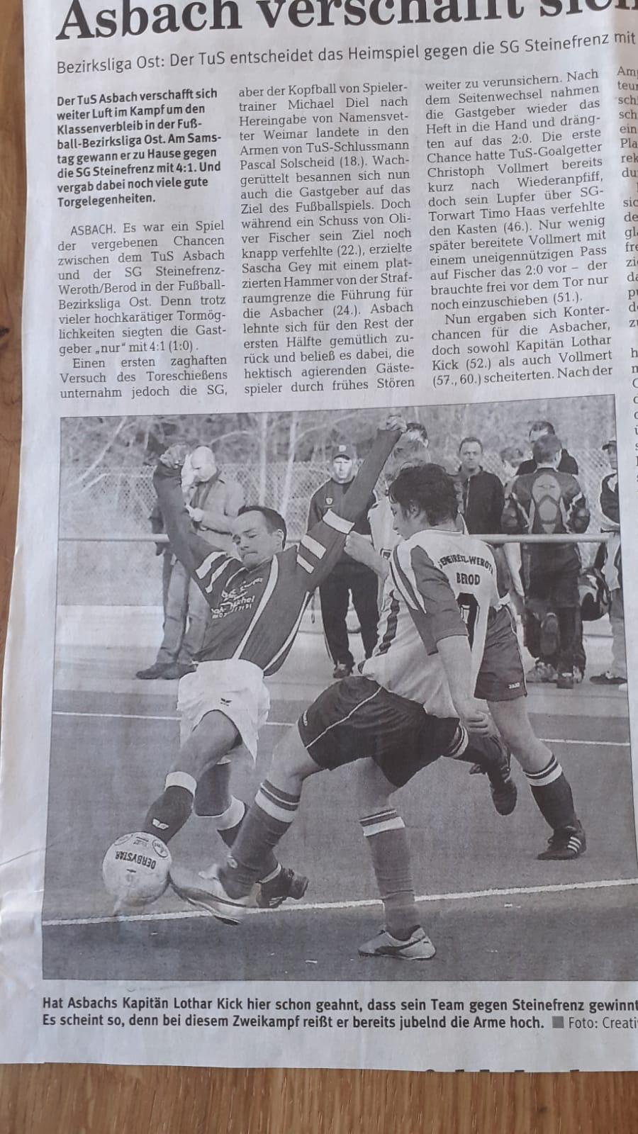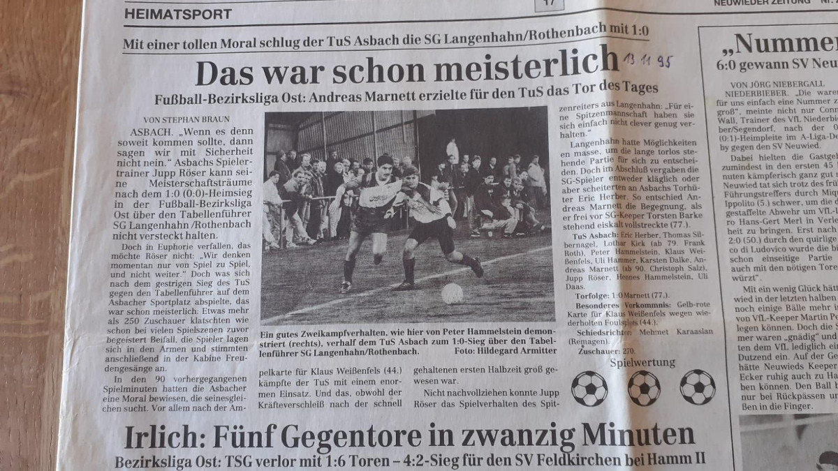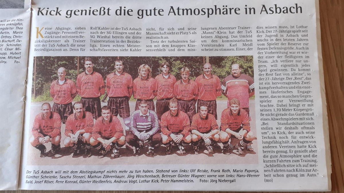 Dazu schrieb damals die Rhein-Zeitung: „Die Asbacher Mannschaft hatte eine Moral bewiesen, die seinesgleichen suchte.... Etwas mehr als 250 Zuschauer klatschten bei vielen Spielszenen begeisterten Beifall. Und nach dem Schlusspfiff lagen sich die Asbacher Spieler in den Armen und stimmten Freuden-gesänge anschließend in der Kabine an...“ Ich kann mir sehr gut vorstellen, dass Loki heute noch Gänsehaut bekommt, wenn er an dieses Spiel denkt.