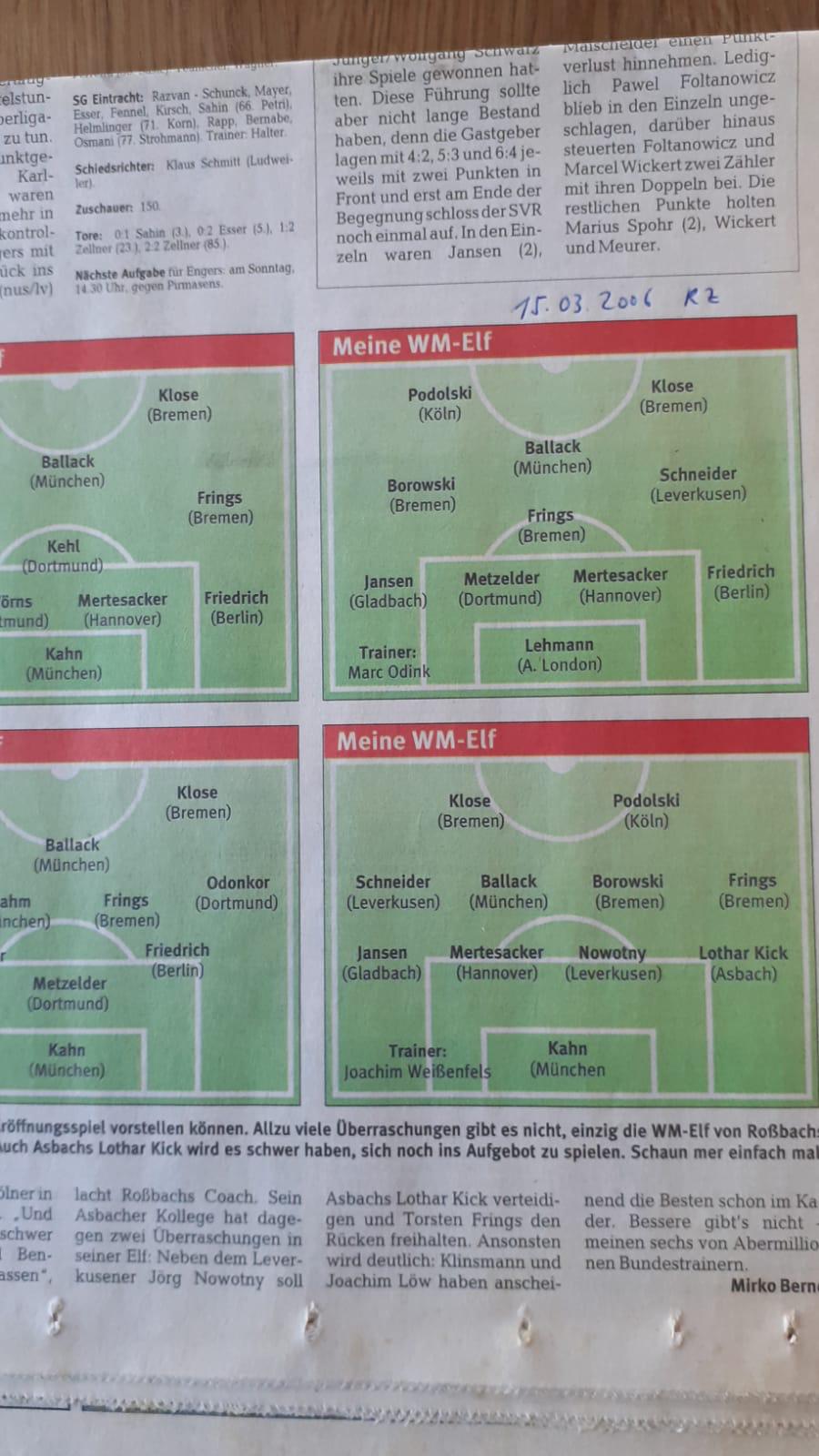 Kurz vor der Weltmeisterschaft 2006 wurden die überkreislichen Trainer von der Rhein-Zeitung nach ihrer Wunschformation gefragt. „Mini“ Weißenfels, sein damaliger Coach, stellte vor Torwart Oliver Kahn (München) folgende Viererkette auf: Jansen (Gladbach), Mertesacker (Hannover), Nowotny (Leverkusen) und Kick (Asbach). Leider konnte er seine Stärke als Ersatz für Philipp Lahm nicht unter Beweis stellen, da das Spiel gegen die Nationalelf leider nicht zustande kam (siehe Weißenfels-Kolumne bei den TuS-Veteranen).