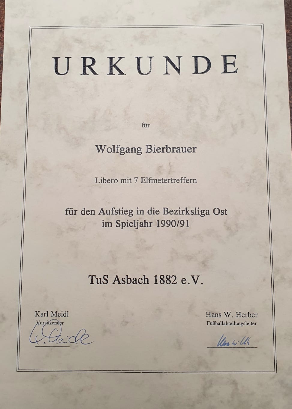Vereinsurkunde, Pressebericht samt Mannschaftsfoto und Bild von der Sektdusche haben daher ihren Platz in „Piffs Trophäenschrank“ gefunden. Und bei seinem letzten Spiel im Jahr 2001 standen Jugendspieler mit einem Banner („Piff, du darfst nicht gehen“!) hinter dem Asbacher Tor.