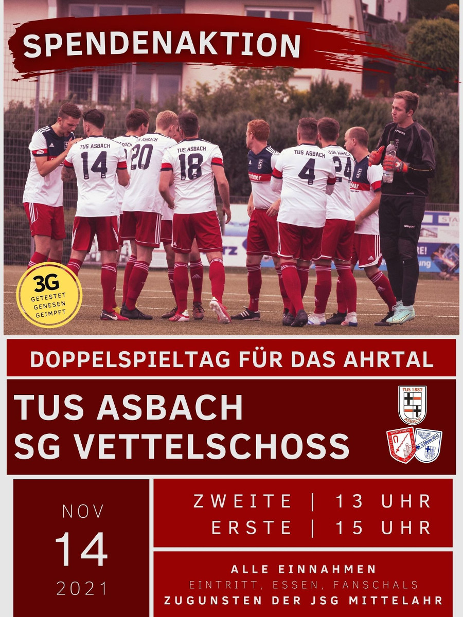 Auf Initiative der Spieler der ersten Asbacher Mannschaft wurde beim letzten Doppel-Heimspieltag im vergangenen Jahr eine Spendenaktion zugunsten der hochwasser-geschädigten Sportvereine im Ahrtal durchgeführt. Auch die Gäste, die beiden Mannschaften der SG Vettelschoß/St. Katharinen, machten Werbung bei ihren Anhängern, sodass eine große Zahl von Besuchern diesen beiden Lokalderbys beiwohnte. Anstelle des Eintritts wurden Spenden von den Zuschauern entgegengenommen. Dazu kamen die Erlöse aus dem Getränke- und Essenverkauf, außerdem stockte der Verkauf von fast hundert Fanschals die Spende nicht unerheblich auf. Bereits am Vortag schloss sich die Jugendabteilung dieser Aktion an und konnte durch den Verkauf von Kaffee und Kuchen bei ihren Heimspielen einen beträchtlichen Betrag hinzufügen. Abgerundet wurde diese Spendensammlung durch Zuschüsse aus den Mannschaftkassen der beiden Seniorenmannschaften und durch den TuS Asbach, sodass am vergangenen Sonntag eine Spende von 3200 Euro durch eine Asbacher Delegation an die JSG Mittelahr auf dem komplett zerstörten Sportplatz in Dernau übergeben werden konnte.