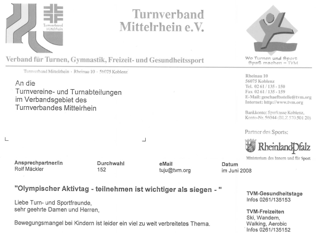 Nachfolgender Text schickte uns der Turnverband Mittelrhein. Alle Interessierten sollten sich mit Gabi Krautscheid (49 36) in Verbindung setzen. ...